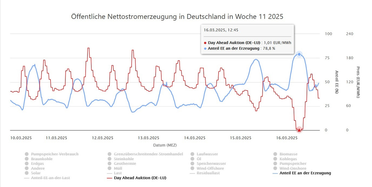 auch in der darauffolgenden Woche der 11. ist das so wenn die Erneuerbaren größere Mengen an Strom abliefern ist der Börsenstrompreis extrem gering.