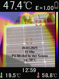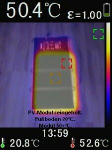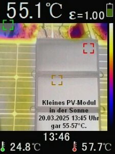 Gerade mal mein kleines Unterwegs-PV-Modul genommen und auf das große Modul in die Sonne auf dem Balkon gelegt. Das hat nach einer 1/2 Stunde fast 60°C erreicht.