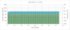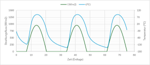 Der tägliche Sonnenlauf verhindert dies. Die Sonneneinstrahlung ist gegeben durch die Höhe über dem Horizont und die Solarkonstante, im Boden absorbiert und der Wärmemenge des Erdbodens zugeführt wird der Anteil (1-Albedo A). Pro Zeiteinheit dt gewinnt der Erdboden am Ort I × (1-A)×dt Joule pro m2.