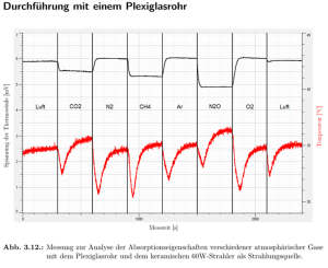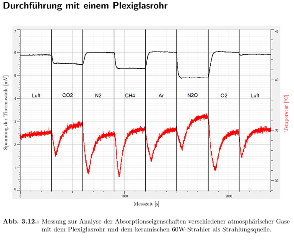 d) Wird ein Gas, dass nicht absorbiert, getestet, so zeigt die Thermosäule ein Maximum an! Bedeutet, dass das CO2 die Sonnenstrahlung im iR Bereich absorbiert und somit hier auch kühlend wirkt! Ohne CO2 in der Atmosphäre wäre die Erde wärmer!