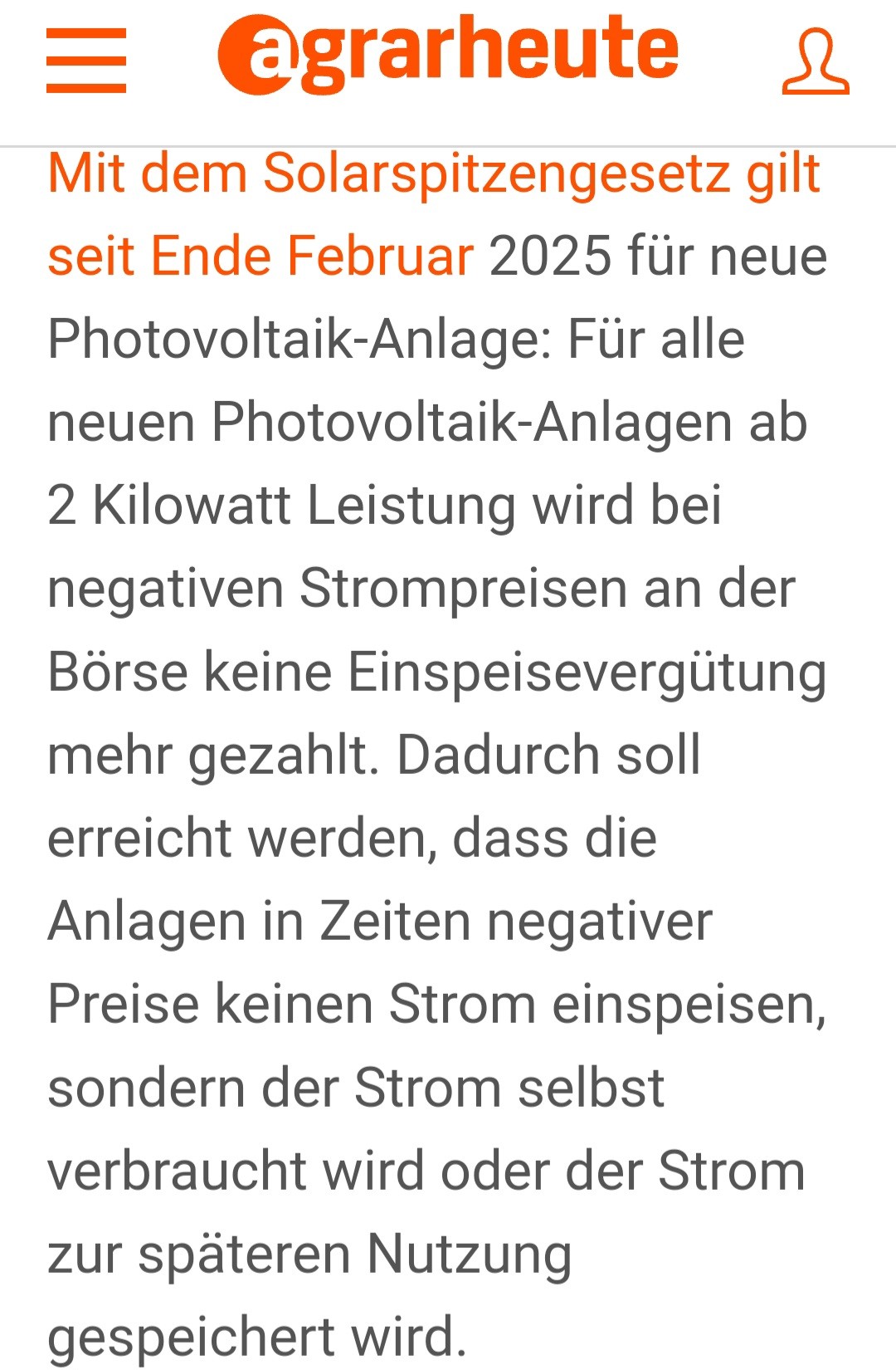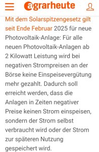 + Solarspitzengesetz der Ampel-Regierung mit Unterstützung von CDU/CSU (gültig für neue PV-Anlagen ab Februar 2025), insbesondere die 60%-Abregelung sowie Entfall der Einspeisevergütung bei negativen Börsenstrompreisen. Um dies zu vermeiden ist eine Erweiterung der Anlage hinsichtlich Steuerbarkeit durch den Verteilnetzbetreiber, der Einsatz größerer Batteriespeicher oder ein netzdienlicher Betrieb mit einem Energiemanagement mit z. T. hohen Zusatzkosten verbunden.