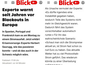 Doch zeigte sich kurz vor dem Ausfall Alarmierendes: So drückten die spanischen PV-Anlagen vor dem Blackout 28,6 Prozent mehr Leistung in die Netze. Das sind ungeheure Energiemengen, die plötzlich zu viel vorhanden sind. Schnell wurden zwar die konventionellen Kraftwerke heruntergefahren. Doch dort gibt es Grenzen. Die sind für sogenannte „Systemdienste“ notwendig, sie halten die Frequenz stabil und sorgen für Momentanreserven als Ausgleich für sehr kurzzeitige Spannungsschwankungen. Ganz abschalten geht nicht. In Frankreich war 8,4 GW zu viel Leistung in den Netzen. Italien konnte lediglich 3 GW Leistung abnehmen.