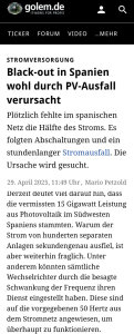 Zuerst ist wohl eine Hochspannungsleitung ausgefallen (ca. 2GW), dann Einbruch der Netzfrequenz und daraufhin haben sich dann 15 GW PV im Südwesten Spaniens vom Netz getrennt. So das Szenario. Das mit der Netzfrequenz ist klar, dass mit dem Wegfall von 15 GW PV auch.