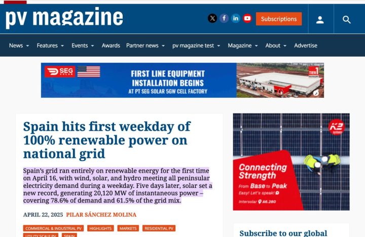 Was die Stromausfälle in Europa betrifft: Spanien ist Berichten zufolge seit dem 16. April zu 100 % auf erneuerbare Energien umgestiegen – hauptsächlich Solar- und Windenergie: