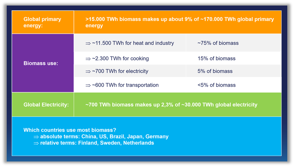 • Elektrizität (~40% der gesamten Primärenergie): Biomasse trägt nur einen kleinen Teil zur Elektrizität bei (700 TWh oder ~2,3% der insgesamt 30.000 TWh). Dennoch, ist der globale Biomasseverbrauch für die Verstromung grösser als der gesamte Stromverbrauch Deutschlands.