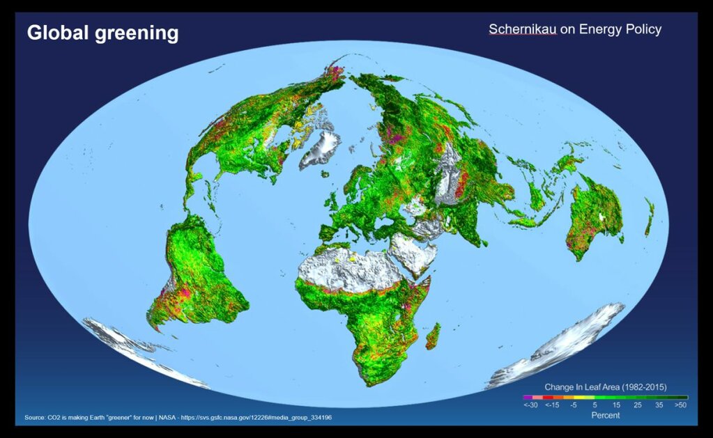Die Geschichte hat auch eine Wendung… der Planet ist in den letzten Jahrzehnten tatsächlich grüner geworden. Dank höherer CO₂-Werte, höherer Temperaturen und der Neubepflanzung durch den Menschen zeigen Satellitendaten einen weltweiten Anstieg des Pflanzenwachstums, der hauptsächlich auf einen „CO₂-Düngeeffekt“ zurückzuführen ist. Also ja, mehr Blätter, mehr Grün.