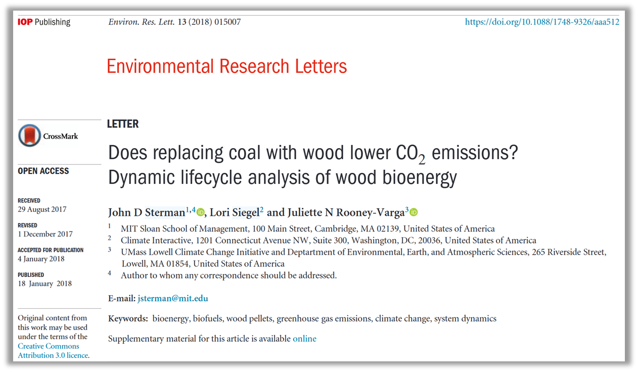 [9] Sterman et al 2018: Does Replacing Coal with Wood Lower CO₂ Emissions? Dynamic Lifecycle Analysis of Wood Bioenergy,  Environmental Research Letters 13, no. 1 (January 2018): 015007. link