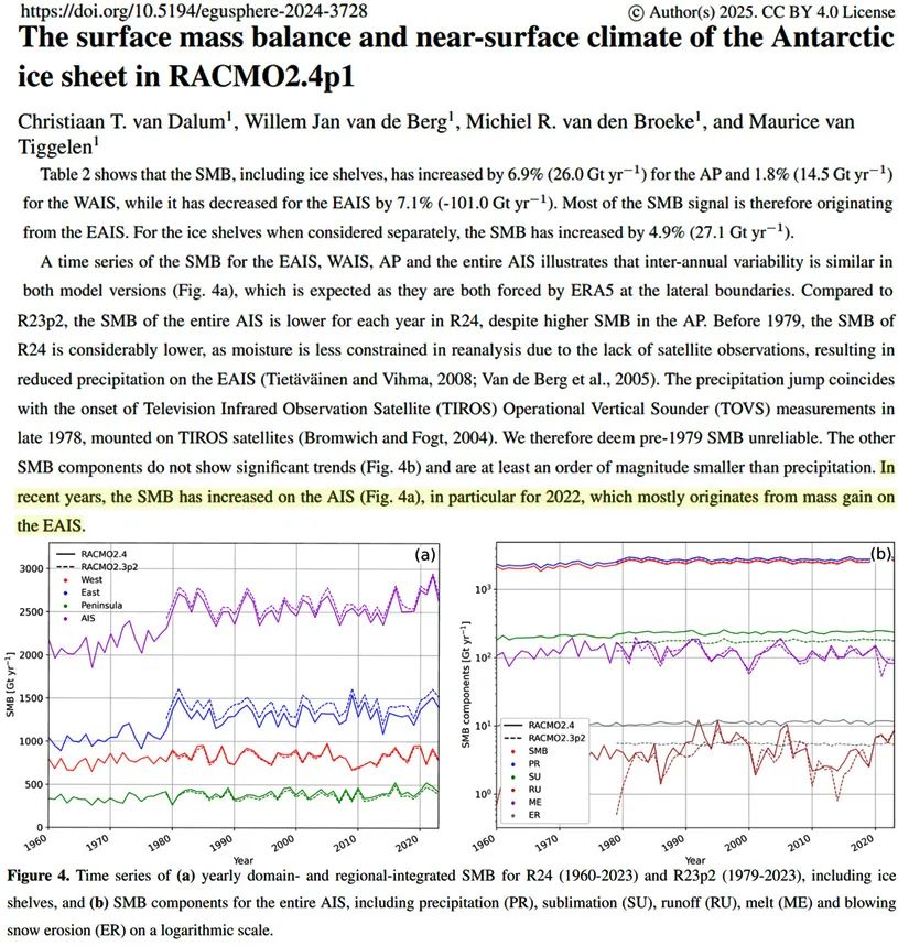 Aus der Studie: Die Oberflächenmassenbilanz (SMB) für den Antarktische Eisschild (AIS) ist seit den 1970er Jahren stabil, dann „hat die SMB in den letzten Jahren auf dem AIS zugenommen, insbesondere für 2022, was hauptsächlich aus dem Massenzuwachs auf dem EAIS resultiert.“