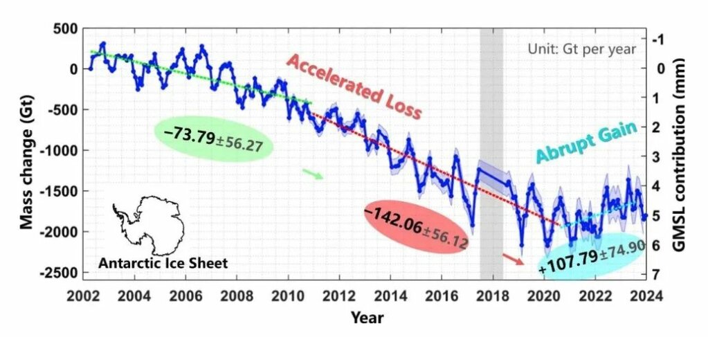 Die Studie ergab, dass der antarktische Eisschild, der in den zehn Jahren zuvor jährlich 142 Gigatonnen verloren hatte, zwischen 2021 und 2023 mit einer Rate von 108 Gigatonnen pro Jahr an Masse zunimmt. Das ist keine geringe Schwankung. Es ist ein ziemlich deutlicher Schwenk.