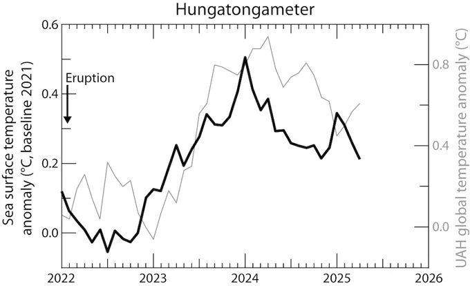 Seitdem haben sich die Ozeane jedoch stetig abgekühlt, was mit dem Abklingen der atmosphärischen Nachwirkungen des Ausbruchs zusammenfiel, wobei der letzte Messwert die niedrigste Temperatur seit Mai 2023 anzeigt.