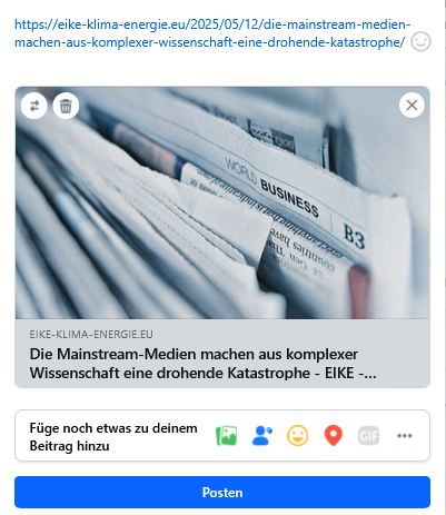 Diese Richtlinien sind sehr allgemein und können nicht jede mögliche Situation abdecken. Nehmen Sie deshalb bitte nicht an, dass das EIKE Management mit Ihnen übereinstimmt oder sonst Ihre Anmerkungen gutheißt. Wir behalten uns jederzeit das Recht vor, Anmerkungen zu filtern oder zu löschen oder zu bestreiten und dies ganz allein nach unserem Gutdünken. Wenn Sie finden, dass Ihre Anmerkung unpassend gefiltert wurde, schicken Sie uns bitte eine Mail über "Über Uns->Kontakt"Die Mainstream-Medien machen aus komplexer Wissenschaft eine drohende KatastropheDiese Aussage ist absolut richtig. Aber warum ist das so bei uns? Grund: Die Redakteure dieser Medien sind ausgesucht, also nahezu handverlesen und erwiesenermaßen linksgrün. Sie wurden über unsere Steuergelder von parteinahen NGOs hochgepampert in die jetzigen Positionen. Beispiele: Alle Nachrichtensprecher des ZDF. Die Folge: Die Mainstream-Medien sind heutzutage Erfüllungsgehilfen der linksgrünen Politik. Die Presse- und Meinungsfreiheit ist abgeschafft worden.