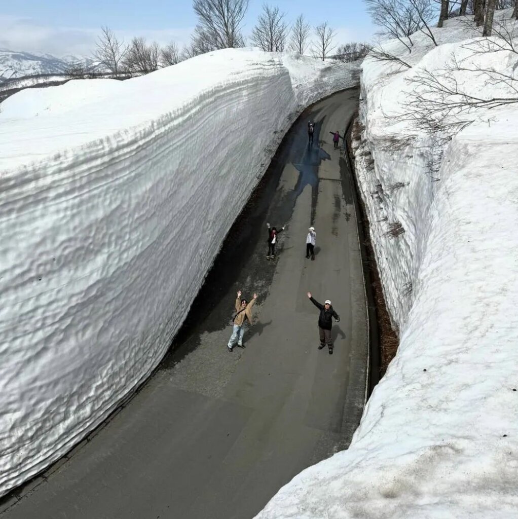 Das auf dem Berg Gassan in der Präfektur Yamagata gelegene Skigebiet ist im Winter aufgrund der extremen Schneefälle nicht zugänglich. Schneepflüge erreichen die 11 km lange Zufahrtsstraße erst im April, wenn die massiven Schneewände selbst zu einer Touristenattraktion werden: