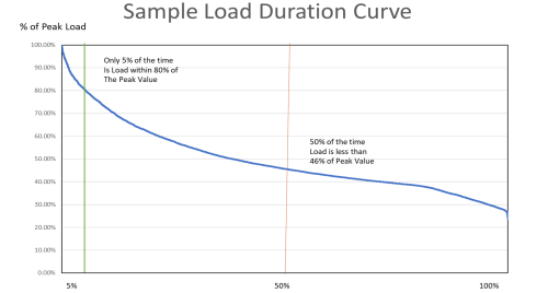 Wenn wir uns von rechts nach links bewegen, sehen wir, dass die Werte in der Nähe des Spitzenwerts nicht lange anhalten, und wenn wir uns nach links bewegen, sehen wir, dass die Last in fast einem Drittel der Zeit deutlich unter 40 % des Spitzenwerts fällt. Bei diesem typischen System liegt die Last nur 1,5 % der Zeit innerhalb von 90 % des Spitzenwerts. Wie oben gezeigt, liegt die Last nur 5 % der Zeit bei 80 % des Spitzenwerts. Niedrigere Lastniveaus überwiegen, da die Last in 50 % der Zeit weniger als 46 % des Spitzenwertes beträgt.