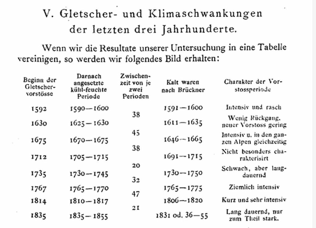 E. Richters 1891 erschienene Publikation mit dem Titel „A History of the Fluctuations of Alpine Glaciers“ (Geschichte der Schwankungen der Alpengletscher) bietet auf 74 Seiten eine akribische Dokumentation des Gletscherwachstums zwischen 1590 und dem oft so genannten „Gletscheroptimum“ um 1850.