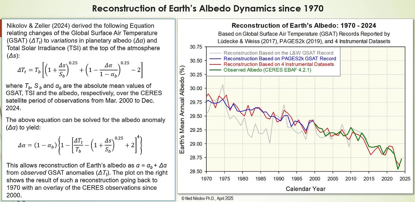 Nikolov und sein Mitautor Karl Zeller (2024) entwickelten eine Formel, die Änderungen der globalen Lufttemperatur (GSAT) mit Änderungen der planetarischen Albedo und der solaren Bestrahlungsstärke – der von der Sonne am oberen Rand der Erdatmosphäre empfangenen Energie – in Beziehung setzt. Anhand dieser Beziehung rekonstruierten sie die Entwicklung der Albedo der Erde bis zum Jahr 1970 zurück. Ihre Ergebnisse stehen in enger Übereinstimmung mit den satellitengestützten Beobachtungen der CERES-Mission der NASA seit dem Jahr 2000.