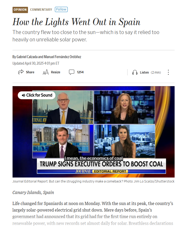 Zitat Anfang vom zweiten Abschnitt: „Der zweite Schlag kam letzten Monat mit dem großen Stromausfall auf der iberischen Halbinsel. Vorläufige forensische Untersuchungen machen deutlich, dass der übereifrige Einsatz von unzuverlässiger Solar- und Windenergie der Dreh- und Angelpunkt war, der 55 Millionen Menschen tagelang im Dunkeln sitzen ließ.“