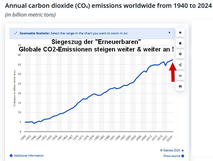 Denken war noch nie Ihre Stärke und wird es wohl auch nie werden. Wenn man die Verdoppelung des weltweiten Verbrauches seit 1996 dagegen hält und sich bewusst wird das heute immer noch 80% des weltweiten Bedarfes von Öl, Kohle und Gas gedeckt werden, dann sehe ich absolut keinen wirklichen Grund zum Jubeln für die Klima-Wandel-Fraktion. Wenn man es denn tatsächlich ernst meinte, mit der Einsparung des ominösen Klimagases, dann ist diese von Ihnen trumphierend dargebotene Grafik eher ein Armutszeugnis ohne gleichen und kein Grund zu frohlocken. Es bedeutet nur, der Ausbau atomarer Erzeugung ist ins stocken geraten und nicht das heute weniger als damals produziert wird damit. Aber Sie werden uns ganz sicher bald erklären warum dies trotzdem gut, gut vor allem fürs Klima ist. 😀