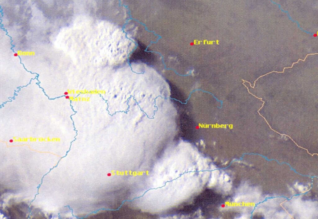 Einschub des Übersetzers 2: Die Organisation eng beieinander liegender konvektiver Zellen zu einem MCS ist nach wie vor nicht vollständig geklärt. Ein Beispiel für eine Kette solcher Systeme zeigt dieses Satellitenbild an einer Kaltfront: