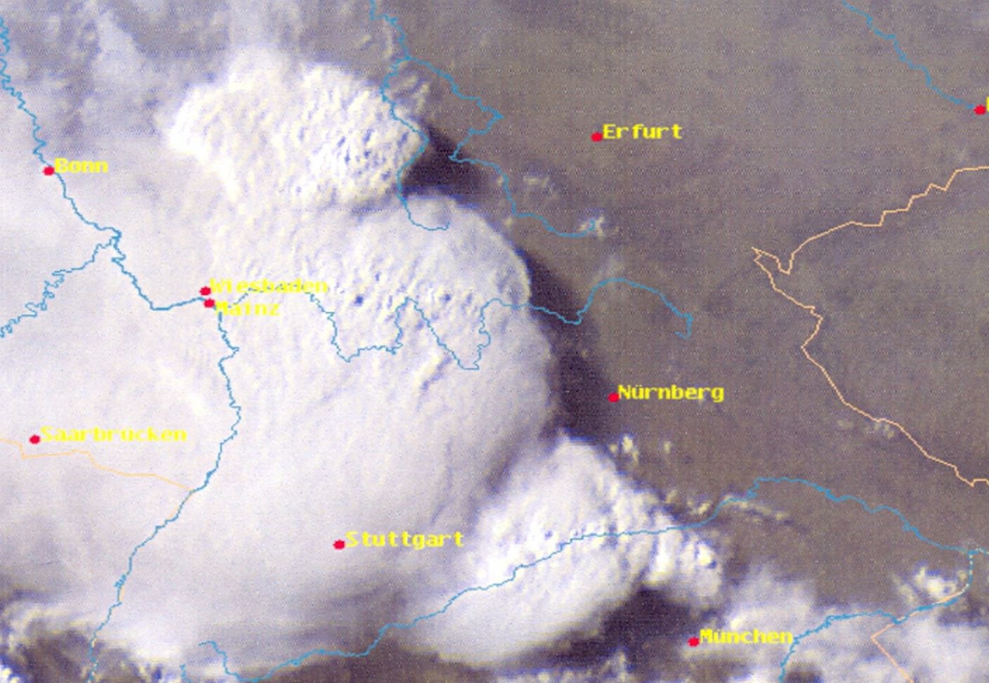 Satellitenbild vom 30. Mai 2008, 17 Uhr UTC (19 Uhr MESZ). Die tief stehende Sonne zeigt gut die Strukturen: Die dunklen Punkte sind Schattenwurf überschießender Kumulus-Türme (Overshooting Tops). Erkennbar wird auch der Schattenwurf und beim mittleren Cluster an der rechten Seite eine ausgeprägte Böenfront.