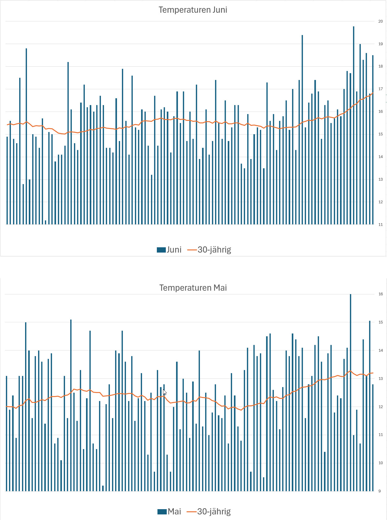 3. Temperaturen von 1988 bis 2025, leichte Maiabkühlung, sehr starke Junierwärmung.