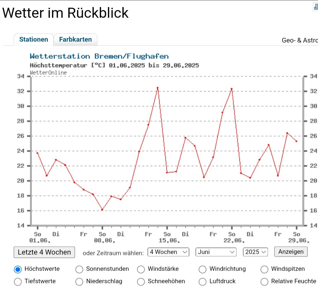 Der Juni 2025 wurde von uns auf 18,5°C taxiert. Man beachte: die ersten 9 Junitage heuer waren kalt – keine Freibadbesucher – und trotzdem war der DWD-Junischnitt der ersten 9 Tage höher als der Vergleichsschnitt vom Gesamtjuni. (16,4 C)