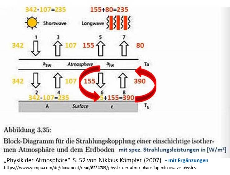 Da strahlt die Erde im Gleichgewicht 235 W/m² über die gesamte (!) Fläche 4πR² ab. Daraus folgert er einen falschen globalen Mittelwert von etwa +15 °C (!) ohne dass ein atmosphärischer Treibhauseffekt nötig ist. Das korrekte Rechenergebnis von GT (144 K) müsse daher mit dem Faktor 2 auf 288 K korrigiert werden.