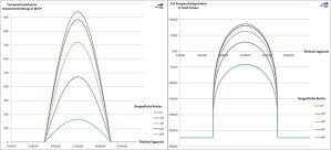Die beiden Grafiken in Abbildung 9 stimmen in der flächenmäßigen Farbverteilung recht ordentlich überein, auch wenn das maximale S-B-Temperaturäquivalent (links) deutlich höher ist als die durchschnittlich gemessene Ortstemperatur (rechts). Über den 24h-Tagesverlauf kehrt sich das in Abbildung 2 (rechts) beschriebene Flächenverhältnis für das konzentrische Berechnungsschema um. Denn die maximale solare Einstrahlung fällt entlang der Längenkreise zu höheren geografischen Breiten ab, während sie mit dem Fußpunkt des solaren Zenits über den 24h-Tagesverlauf wandert.