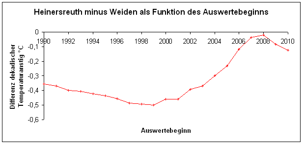 Die folgende Graphik zeigt die Differenz der dekadischen Temperaturzunahmen zwischen Heinersreuth und Weiden. Die Differenz ist negativ weil Heinersreuth „kälter“ ist als Weiden.