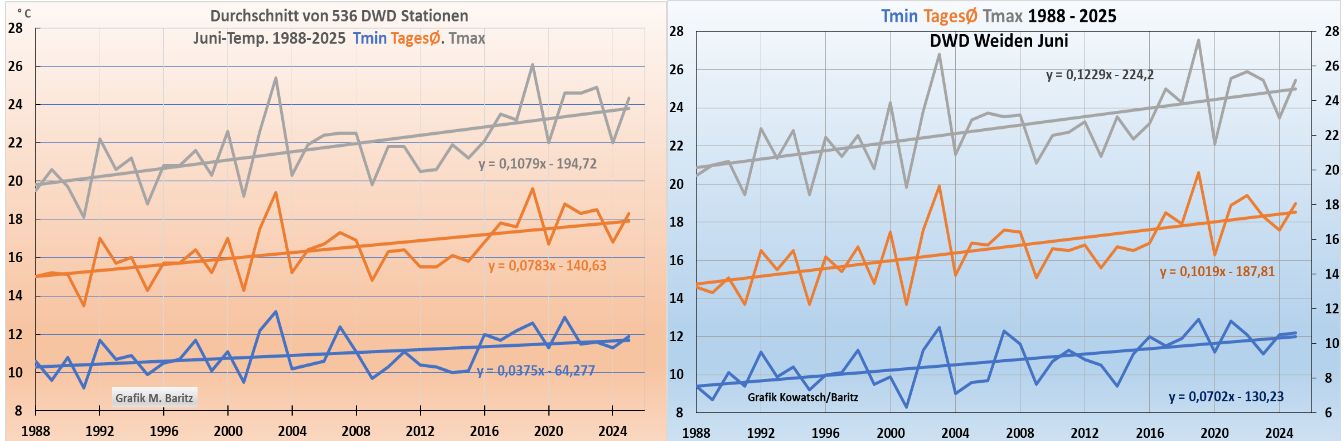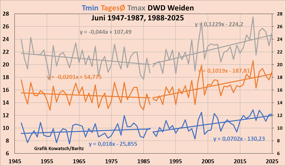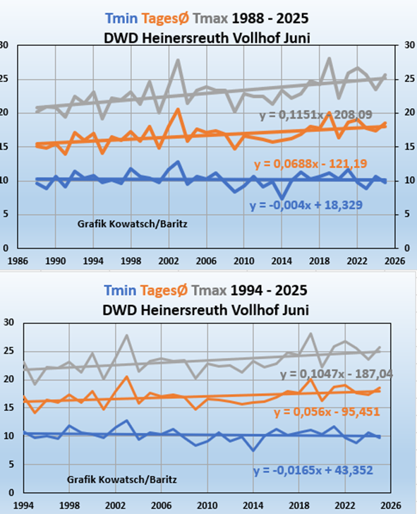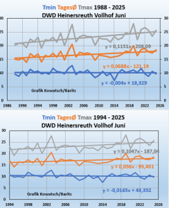 Natürlich haben wir das und auch bereits genannt, die nur 50 km von Weiden entfernte DWD-Station Heinersreut. Und da sind beim Juni die Steigungsformeln nur halb so groß und T-min hat gar keine Steigung.