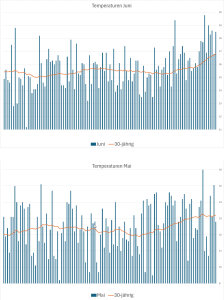 Abb. 1a/b: Oben in grau die Höchsttemperaturen tagsüber, ganz unten in der Farbe Blau die Tmin-Temperaturen, die im Sommer meist kurz vor Sonnenaufgang auftreten.