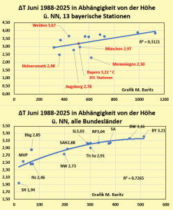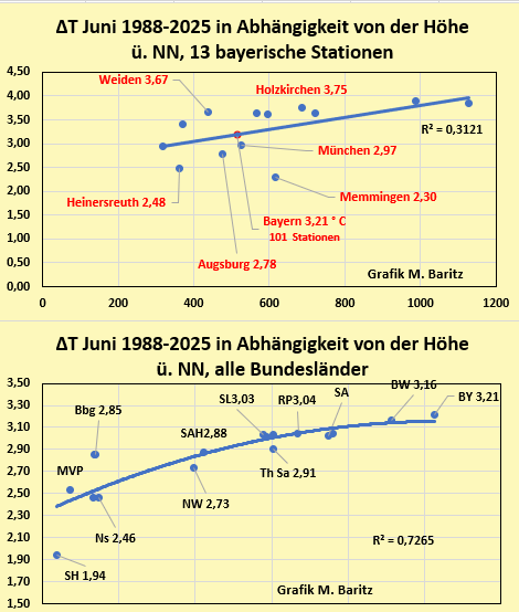 Herr Schwerdt, nun haben Sie mich wirklich auf eine Idee gebracht. Wir müssen in unseren ‘Bedingungen für eine Station mit stark steigendem Wärmeinseleffekt‘ einen weiteren Punkt ergänzen, zumindest vorerst für den Monat Juni:Punkt 9: ΔT für den Temperaturanstig im Zeitintervall 1988-2025 hängt stark von der Stationshöhe über NN ab. Ich habe mir dazu 13 bayerische DWD Stationen und Bayern (mit 101 Stationen) genommen, deren Steigung bestimmt und daraus die Temp.-Änderung berechnet (so, wie Sie es auch gemacht haben) und diese in Abhängigkeit zur Stationshöhe grafisch aufgetragen. Parabelfit und Geradenfit sind so gut wie identisch. obere GrafikWas auffällt ist, dass DWD Weiden deutlich oberhalb und Heinersreuth deutlich unterhalb des Fits liegen. Memmingen noch deutlicher. Dort sind weitere Faktoren mit verantwortlich. Welche? Herr Kowatsch hat ja schon aufgefordert, Gründe für dieses nicht unbedingt zu erwartende Verhalten der Erwärmung bei Weiden zu suchen.