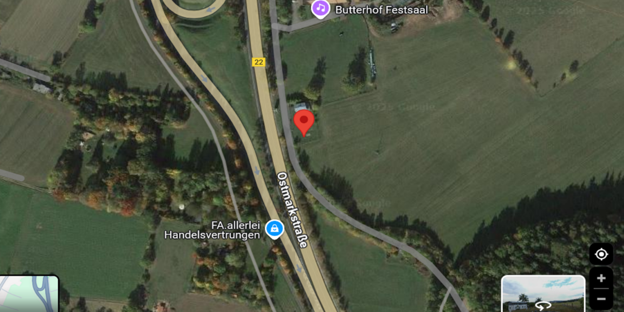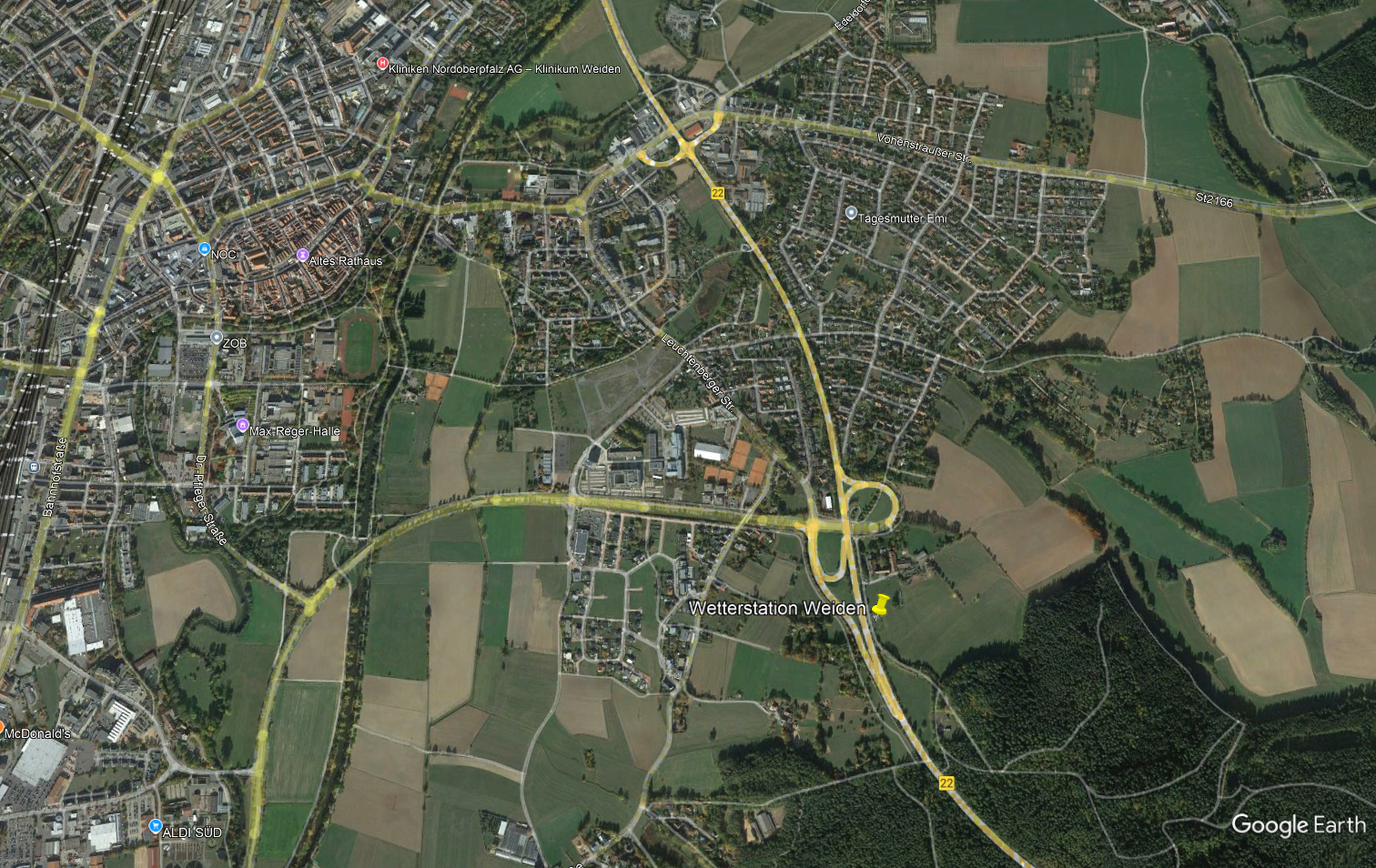 Abb. 2a: Die Stadt Weiden liegt nordwestlich der Wetterstation. Diese befindet sich direkt neben der Bundesstraße 22, die sich just in Stationsnähe asphalterweiternd aufspaltet.