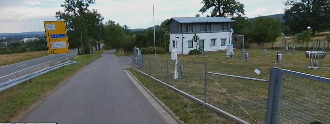 Abb. 2b: Zwei Spuren Bundesstraße Richtung Norden und zusätzlich die Abbiegespur nach Weiden. Direkt vor der Station der breite grüne Planweg. Der Hang ist leicht geneigt und entwässert nach links ins Tal. Man beobachte auch das schützende Gebäude direkt bei den Wetterstations-Elementen.