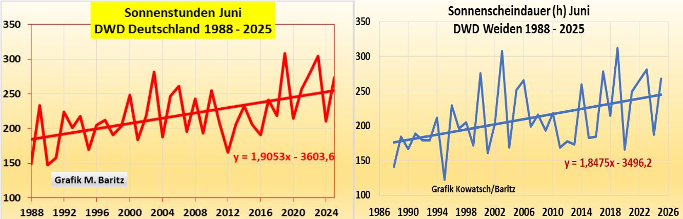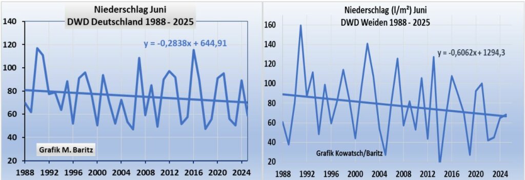 Im Juni wird es seit 2019 kühler, das sehen Sie aus allen unseren Grafiken, gezeichnet nach den DWD-Temperaturreihen, im DWD-Deutschlandmittel und bei allen Stationen. In Weiden etwas weniger fallend. Aber Sie schauen unsere Artikel eh nie an.