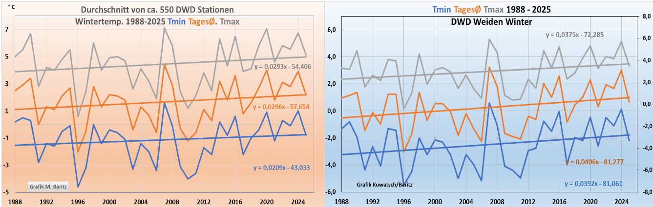 Der neuzeitliche Klimawandel begann in Deutschland und Mitteleuropa im Jahre 1988. Je nachdem wo die DWD-Wetterstationen stehen, ergeben sich mehr oder weniger starke Temperatursteigerungen, die sich auch noch deutlich unterscheiden, wenn man die nächtlichen Tiefst- und die Tageshöchsttemperaturen mit vergleicht.