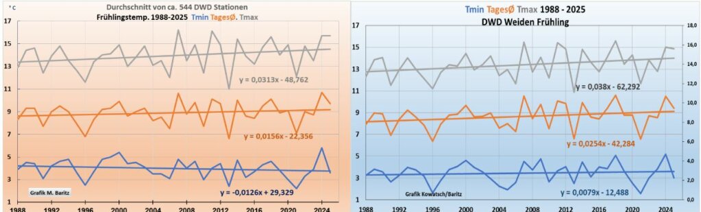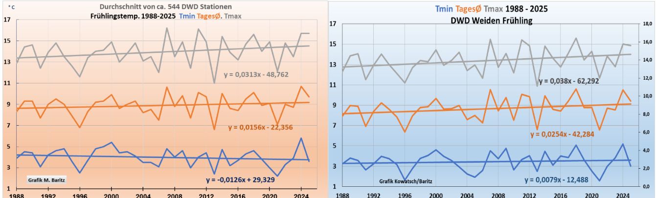 Abb. 6a/b. Frühlingsvergleich DWD-Deutschland und Weiden. Insbesondere die nächtlichen Tiefsttemperaturen sind positiv, beim DWD dagegen fallend. Der Frühling wird in Deutschland nachts kälter. In Weiden nicht. T-Min zeigt bei allen drei Grafikvergleichen eine höhere Steigung als beim DWD. Woher kommt die sich steigernde nächtliche Zusatzwärme, insbesondere auch beim Monat Juni?