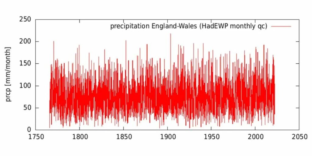 Die Niederschlagsaufzeichnungen für England und Wales reichen bis ins 18. Jahrhundert zurück. Bei vollständiger Betrachtung – wie in den rohen HadEWP-Monatsreihen (siehe unten) – gibt es keinen Trend bei den extremen Niederschlägen. Das nasseste Jahr war nicht in jüngster Zeit, sondern 1872. Kein moderner Anstieg der Extremwerte. Nur natürliche Variabilität, wie immer.