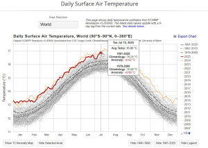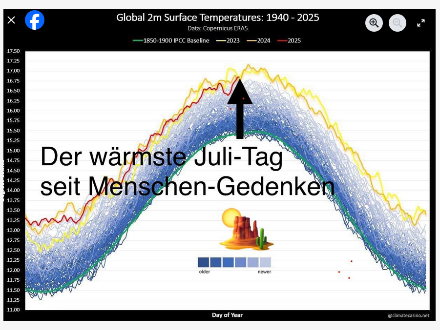 In der Tat schrieben einige Leser bei Facebook darunter, daß ihr 14. Juli 25 regnerisch und unter 20°C war. Das ist natürlich genau so eine nicht representative Einzelbeobachtung. In Italien hingegen „schmolzen die Straßen“, wie Carla Reemtsma anmerkte. Was eher am schlechten Asphalt der Cosa nostra liegen mag – solche lokalen Temperaturmeldungen haben nur geringen bis gar keinen Wert. Man muß sich aber schon fragen, wie es weltweit zum heißesten 14. Juli kommen kann, wenn der Südwinter heuer recht kalt ausfällt (Australien etc. haben vertauschte Jahreszeiten – und gerade viel Schnee) und Mitteleuropa eher herbstliche Temperaturen mißt. Wurde da wie 2024 mit dem Satellit wieder auf den schmelzenden Asphalt oder nackten Fels in Italien gezielt?