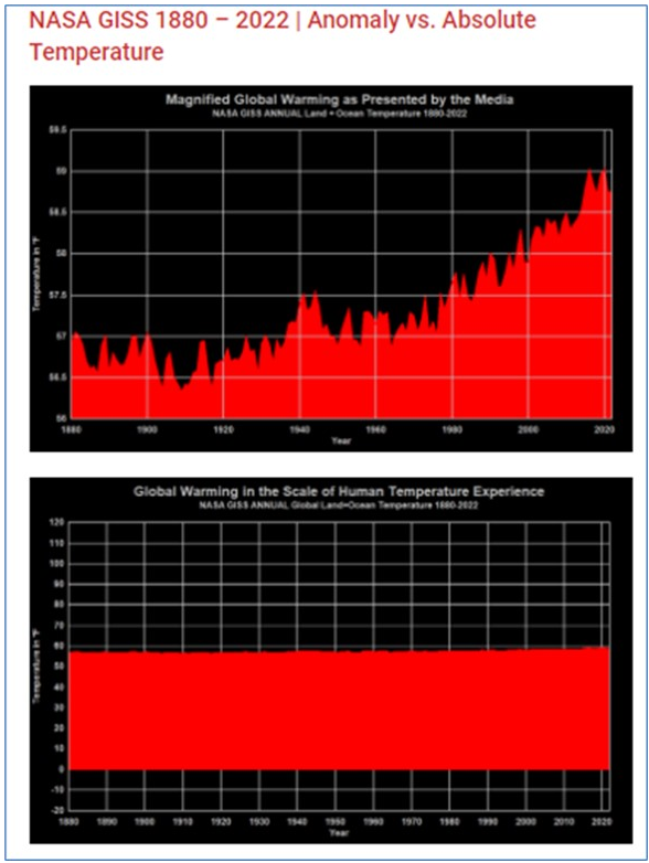 Alle Graphiken welche die „Temperaturanomalien“ anzeigen sind ein geschickter Betrug am Betrachter. Es ist die Skalierung der Y-Achse welche den optischen Betrug erzeugt. Die gesamte Temperaturspreizung auf der Erde beträgt 330 K (Wüste) – 193 K (Antarktis) ==> +/- 140 K. Nimmt man jetzt als Skalierung der Y-Achse diese 140 K dann sieht man dass man nichts sieht! Die bedrohliche „Temperatursteigerung“ (die auch noch künstlich erzeugt wird) ist im Maßstab der realen Temperaturspreizung nicht sichtbar.