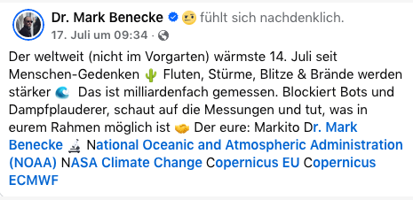 Seine 2024er Vorhersage des Höllensommers, die nicht eingetreten ist, wurde von den Medien im Herbst nicht kritisch aufgenommen – Klimaalarmisten können erzählen, was sie wollen, Verantwortung müssen sie fast nie übernehmen. Im Gegenteil: Benecke macht auch 2025 fleißig weiter und berichtet in den sozialen Medien von „wärmsten Tagen seit Menschenedenken“.