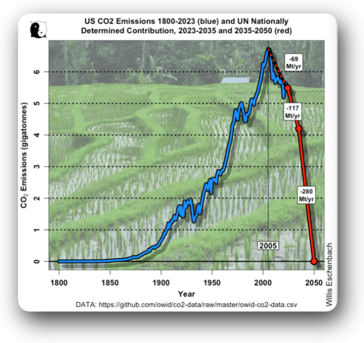 Hier sind die CO₂-Emissionen der USA für jedes Jahr zusammen mit den NDC-Zielen aufgeführt: