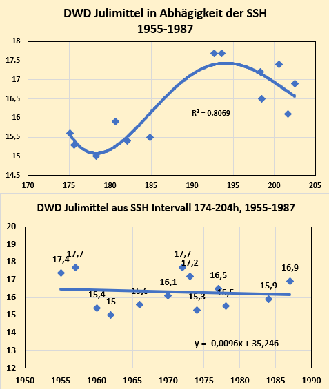 Dazu schrieb ich: Alle Juli- Temperaturen ab 1951 bis vor 1988 sind in dem untersuchten Sonnenstunden- Intervall niedriger als die Juli- Temperatur 2025.