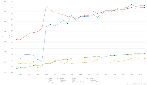 Was die Kulturen betrifft, auf die sich BSC und die Medien am meisten konzentrieren, nämlich Salat und Kohl, so zeigen Daten der Ernährungs- und Landwirtschaftsorganisation der Vereinten Nationen zwischen 1993 und 2023 Folgendes: (dem jüngsten 30-jährigen Zeitraum des Klimawandels, für den uns Daten vorliegen):