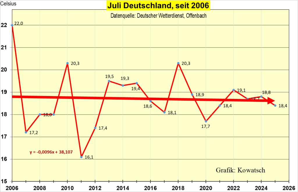 Auch für diesen Sommer hatte die Klimanotstandsfront eine große Klimapanik-Kampagne mitsamt der üblichen übertriebenen Angsthysterie und Lügen auf breiter Front geplant, aber das Juli-Wetter in Deutschland spielte nicht mit. Sogar „Bild“ widersprach jüngst den Hitzekatastrophenvorhersagen. Der Juli 2025 war nicht wie von den bezahlten Panikmachern orakelt, der heißeste Juli seit Messbeginn, kein Hitzetotenrekord, und es wurden überhaupt keine neuen Tages-Temperaturrekorde aufgestellt, auch nicht bei den DWD-Stationen, die zunehmend an wärmeren (WI-belastet) Orten platziert und betrieben werden. Der Deutsche Wetterdienst registrierte diesen Juli mit 18,4 Grad, (letztes Jahr 18,8°C) Überhaupt kein Klimanotstand in Sicht, siehe Grafiken weiter unten.