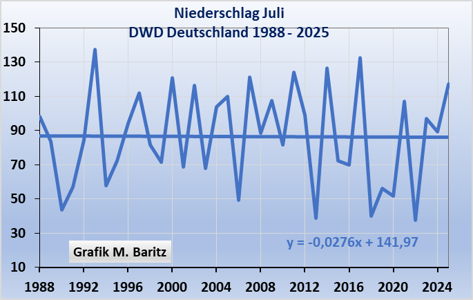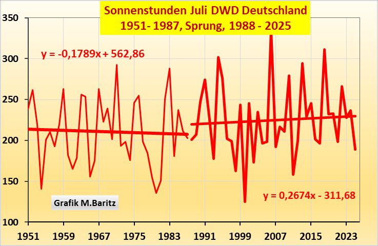 Beachte: Aber seit 2006, also seit 20 Jahren ist bei den Sonnenstunden ähnlich wie bei den Temperaturen eine gewisse Sättigung erreicht. Mehr Julisonne geht nicht. Die Zunahme der Sonnenstunden sind ausgereizt. Das schlägt sich sofort im Temperaturverlauf nieder. Der Juli 2006 war der eindeutig wärmste bisher und hatte auch die meisten Sonnenstunden. In den letzten 3 Jahren prophezeite die CO₂-Klimagemeinde stets einen neuen Allzeittemperaturrekord. Lauterbach und die Medien standen ganz gierig in den Startlöchern mit der Forderung nach Klimanotstand, Hitzelockdown und sonstig dummen Klimageschwätz. Die Aufnahme von Klimaschutz ins Grundgesetz ist nun ja trickreich umgesetzt worden. Damit wurde jeder Klima-Blödsinn übers Grundgesetz gedeckt. Und selbstverständlich wird die letzte Generation weiter einen sofortigen Stopp des Klimawandels fordern. Bis auf ein paar Platzbesetzungen in Bremen und anderswo, und in reichen Stadtvierteln in Berlin den SUV-Fahrzeugen über Nacht die Luft aus den Reifen gelassen, wurden alle angedachten Propagandaaktionen wegen des kühlen Julis 2025 abgeblasen.