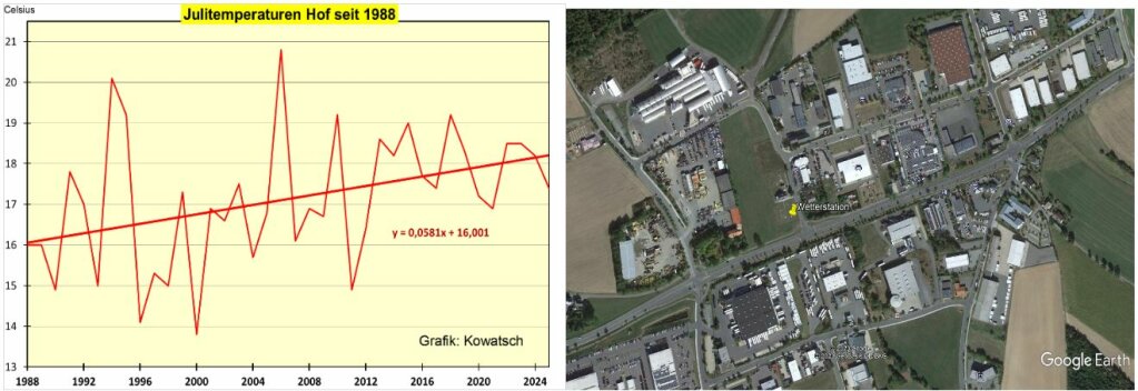 Folge: Siehe den starken Anstieg der Julitrendlinie bei der Wetterstation Hof, 2,5 Grad Julierwärmung in 37 Jahren, fast doppelt so viel wie der DWD-Schnitt. Dagegen hat die benachbarte Privatwetterstation Amtsberg in Sachsen (fast WI-frei) fast gar keine Julierwärmung seit 1988. Da das Gewerbegebiet in Hof noch weiter wächst, zeigt die Trendlinie in Hof seit 2005 im Gegensatz zum benachbarten Amtsberg immer noch einen weiteren deutlichen Temperatur-Julianstieg. Bitte auch beachten: Hof liegt über 100m höher als die Wetterstation in Amtsberg. Die DWD-registriert für Hof in den letzten 10 Jahren aber gleich hohe Julitemperaturen und nicht die zu erwartenden um 1 Grad im Schnitt tiefer.