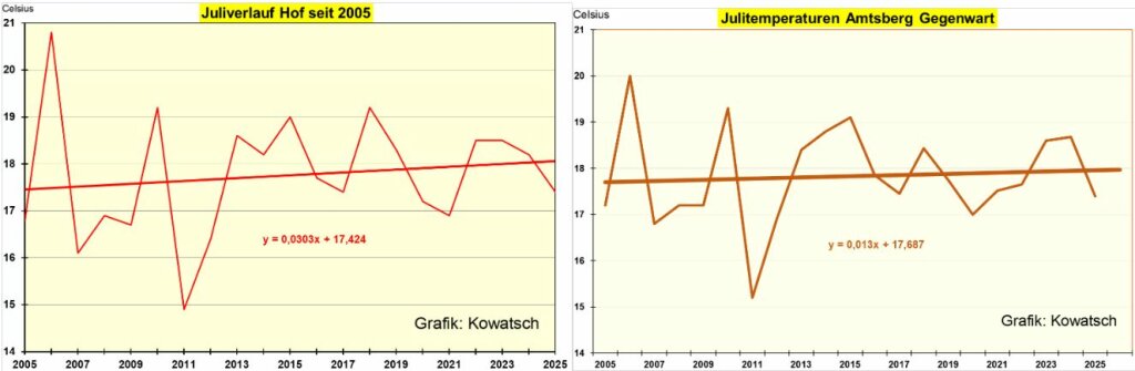 Beide Wetterstation Weiden und Heinersreuth entwickelten sich bei den Juli- Tagesmittel- Temperaturen im Zeitraum von 2006 bis 2025 wie folgt: