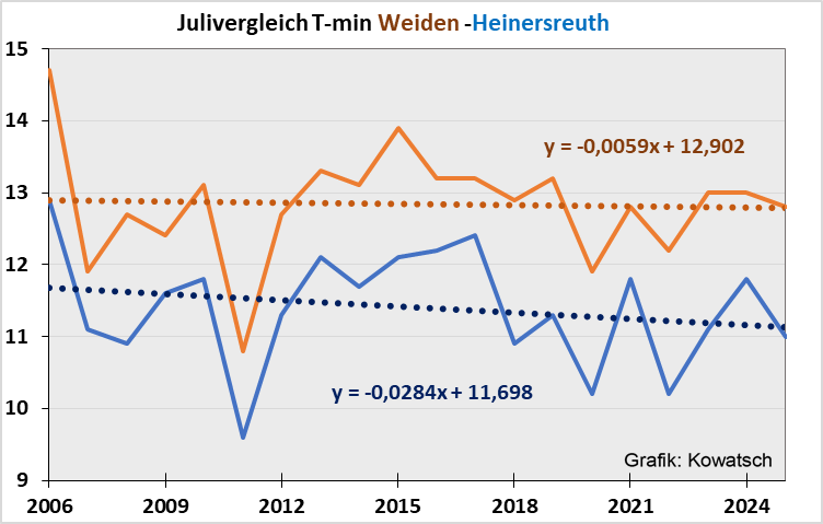 Heinersreuth ist sehr ländlich bei einem Bauernhof außerhalb des Ortes, die Messstation Weiden steht südlich am Stadteingang, ähnlich wie Hof an einer mehrspurigen Bundesstraße. Wir vergleichen diesmal nur die nächtlichen Tiefsttemperaturen, die im Juli kurz vor Sonnenaufgang erfasst werden.