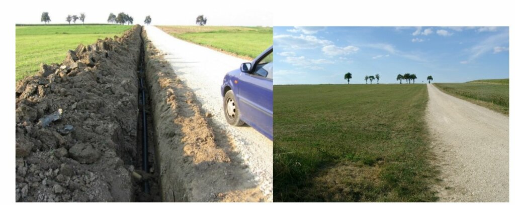 Abb. 10: Deutschlands Fluren sind großflächig mit Drainagen und perforierten Sickerungsschläuchen trockengelegt. Übrigens auch die Wälder. Zur schwarzen Drainleitung entlang des Feldweges münden auf dem Bild von links alle 15 Meter gelbe Saugleitungen, welche die Wiese trockenlegen. Die erste gelbe Saugleitung ist erkennbar. In trockenen Sommern sieht die Wiese dann braungrüngelb aus mit spärlichem Grasbewuchs im August. (rechtes Bild). So erzeugt man Steppen in Deutschland. Fotos Worm/Kowatsch.