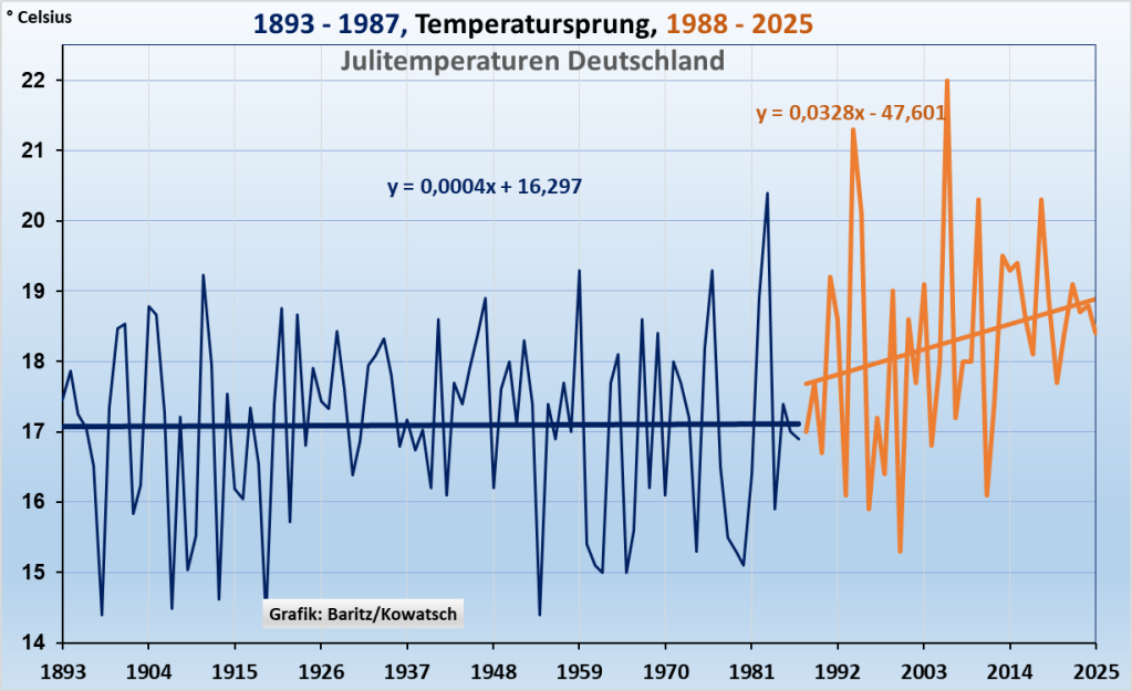 Die vom mainstream, von der Politik und den bezahlten Wissenschaftlern insbesondere des PIK Potsdam behauptete starke Klimaerwärmung findet beim Monat Juli zwar statt, aber erst seit 1988!!! Seit der Gründung des Weltklimarates. Und 2005 war auch schon wieder Schluss. Deshalb kann CO₂ auch nicht der Hauptverursacher der Erwärmung sein. Vor 1988 kühlte der Juli sogar 45 Jahre lang ab!!! Die Daten des Deutschen Wetterdienstes beweisen eindeutig: Kohlendioxid kann kein starker Erwärmungstreiber sein. Dieses angebliche Treibhausgas wirkt allerhöchstens in minimalen aus den Grafiken nicht erkennbaren versteckten Kleindosen im Klimarauschen der DWD-Daten mit, und zwar unmerklich erwärmend oder auch abkühlend.